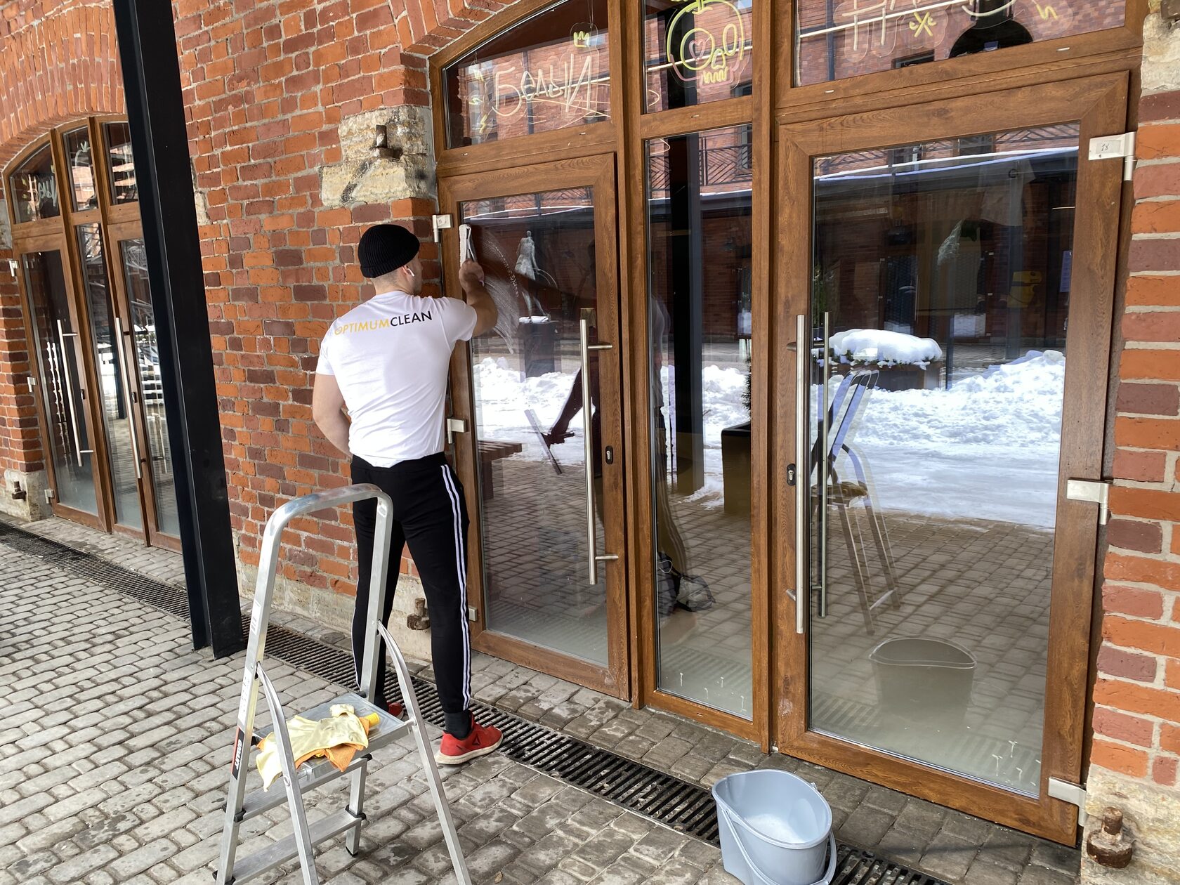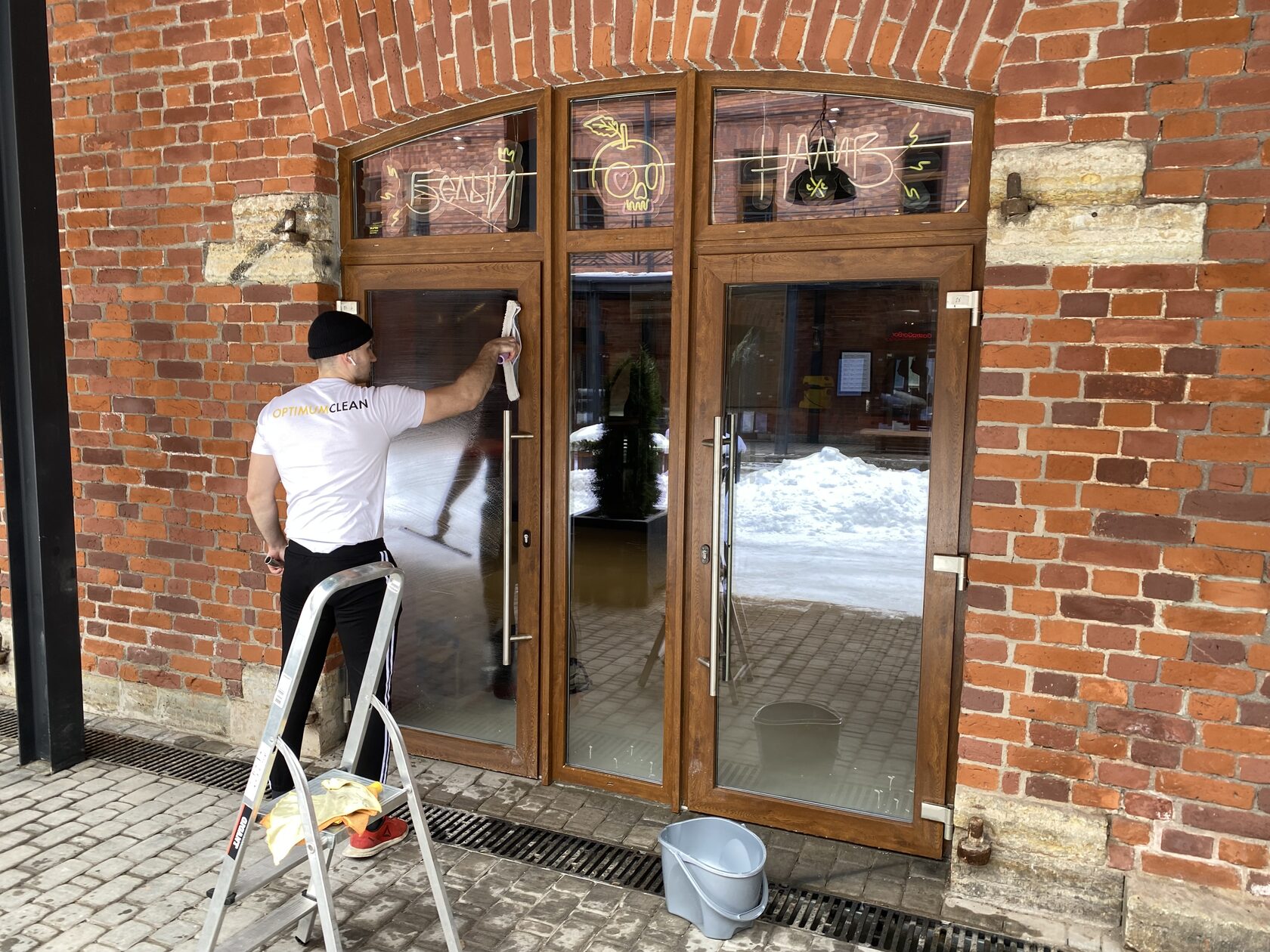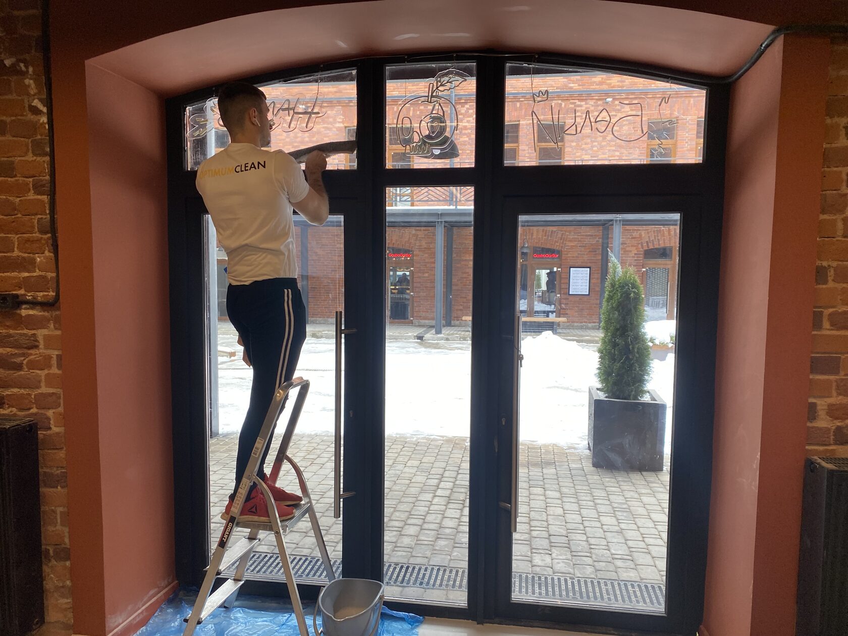 Сегодня мы были в очень колоритном месте, ресторане с римской пиццей в панковском интерьере в Пространстве Сено. Современный, яркий интерьер, привлекающий внимание. А раз привлекают внимание, то нужно поддерживать чистоту, это как имидж заведения. Если во время проведения досуга грязь видна для посетителя, то он может усомниться в чистоте заведения внутри, на кухне. Тем более, речь идет о входной группе ресторана. Вернуть глянец остеклению крайне важно.