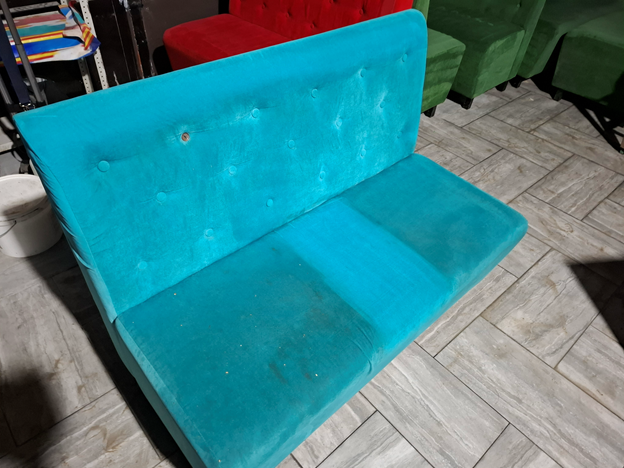 Работал наш мастер Александр, выезд был ночной, чтобы не мешать работе кафе. Мебель досталась, мягко говоря, непростая — очень грязная. И это абсолютно объяснимо: для небольших мест регулярная химчистка раз в месяц — дорогое удовольствие, поэтому чистят редко. В итоге загрязнения становятся въевшимися, и работать с ними сложнее.