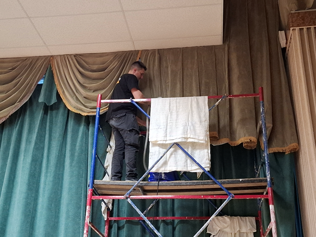 Работы проводились со строительных лесов, так как высота занавеса не позволяла выполнять чистку с пола. Это добавляет ответственности: важно одновременно контролировать качество обработки ткани, количество влаги и безопасность работ на высоте. Благо наши сотрудники имеют сертификаты работы на высоте от профильных обучающих центров.