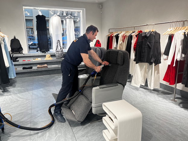 Дополнительно мастер почистил кресла, которые тоже активно используются клиентами. Посадочные места — одни из первых, где появляется загрязнение, особенно в магазинах с высокой проходимостью. Здесь задача была та же: быстро привести всё в порядок без лишнего шума и запахов.